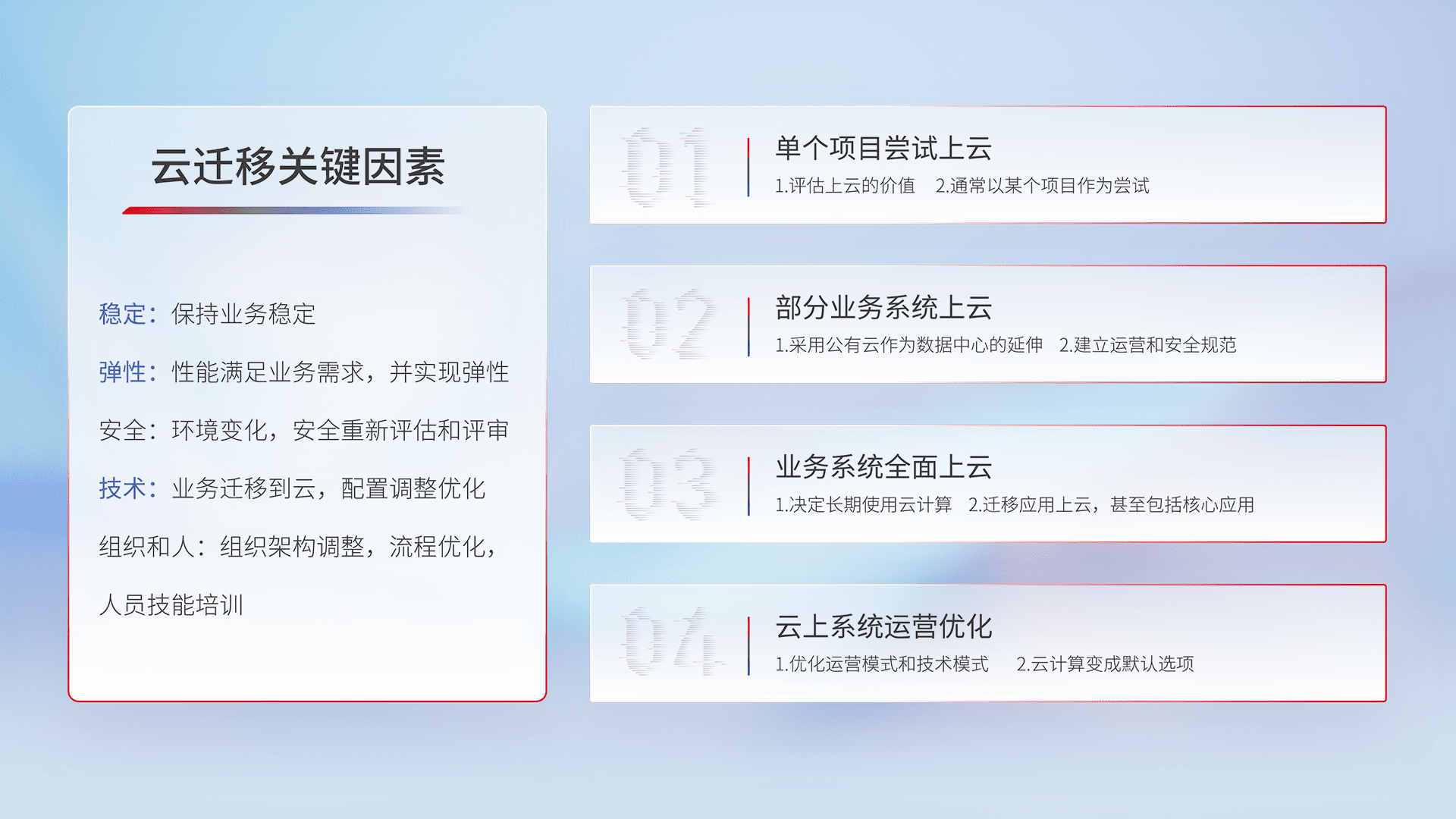 结合实际业务,,,,从规划设计、、、、云平台选型、、、、云原生改造、、、、数据迁移、、集成交付,,迁移全过程为客户识别最佳上云路径,,,,做好风险识别管理,,,设计网络架构、、、身份权限、、、安全审计合规、、、操作审计、、、日志审计、、监控告警策略、、、、多站点容灾设计等,,对云上基础设施进行整体规划,,,,提升IT治理水平,,以满足弹性、、、、高可用、、、、高性能的需求。。。。