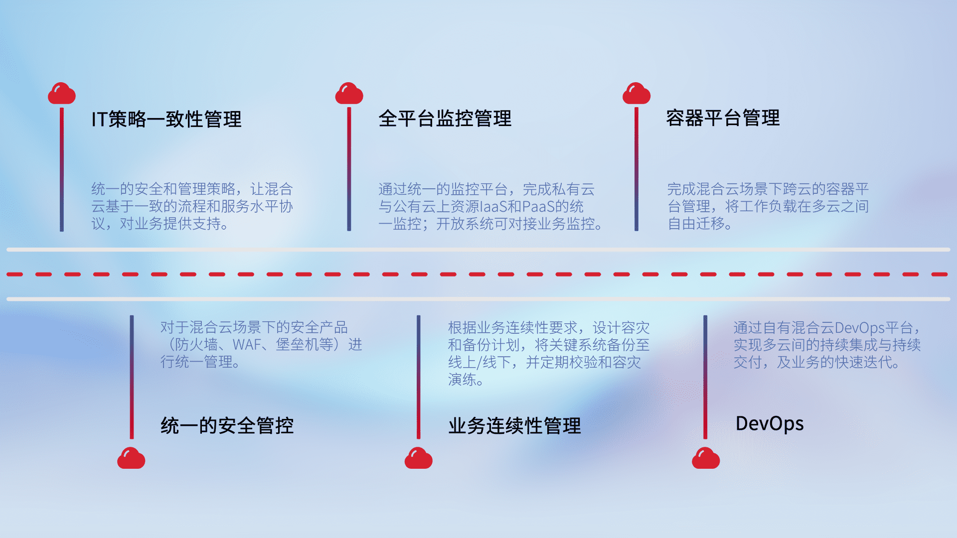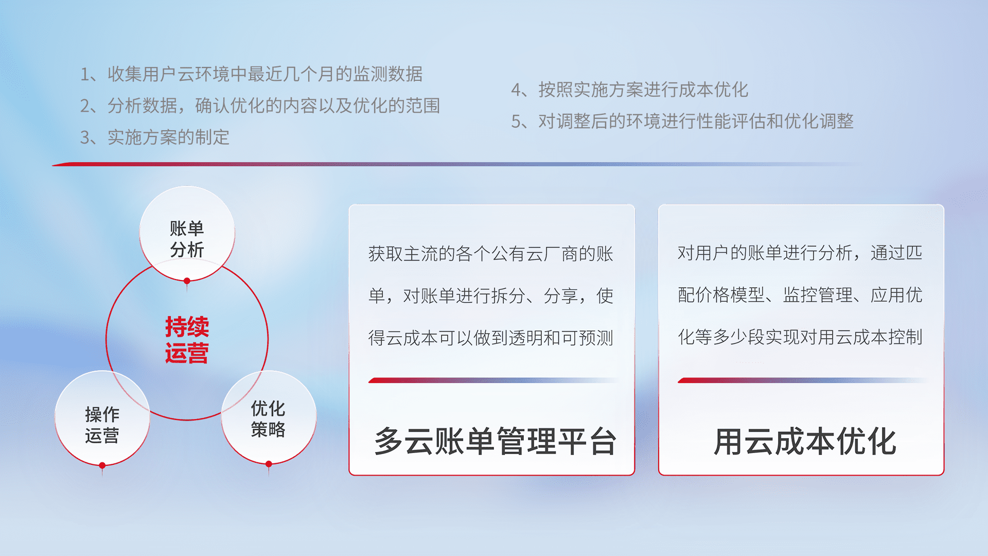 通过多云纳管,,,以统一的资源数据模型把客户的云资源进行抽象和封装,,进而实现对多云资源的统一操作,,保障云资源管理的可靠性、、、稳定性与可用性。。量身定制化运维内容,,,配置、、开发运维、、补丁管理、、、备份、、、、监控、、、认证和访问管理、、、审计和日常巡检等,,保障在用云过程中的可靠度,,稳定度以及高可用率。。。