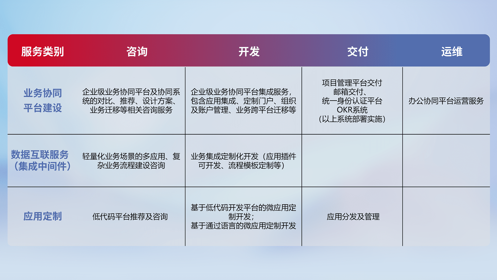 针对钉钉、、、企微、、、IDaas等平台级产品提供产品的规划、、方案、、交付、、、定制化开发等服务,,实现如统一协同办公、、、、智能客户服务、、、、混合会议管理、、智能数据查询、、、、等业务场景,,,,实现数字化转型。。。